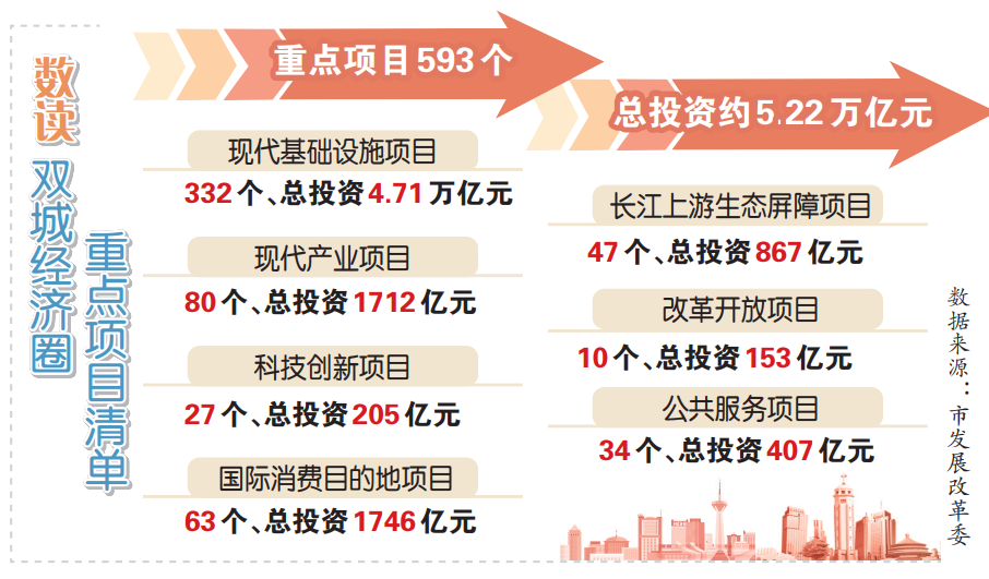 8月17日,重庆日报记者从市发展改革委获悉,《成渝地区双城经济圈建设规划(方案)明确重点项目清单》(简称《清单》)近日正式印发,双城经济圈规划纲要和相关专项规划(方案)明确重点项目593个、总投资约5.22万亿元。《清单》对项目建设时序、建设任务、责任单位等进行了逐一明确,把双城经济圈建设“规划图”变为“施工图”,“责任制+清单制+销号制”推动重点任务落地落实。