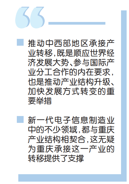 从现场各专家、企业代表发言来看,新一代电子信息制造业中的不少领域,都与重庆产业结构相契合,这无疑为重庆承接这一产业的转移提供了支撑。