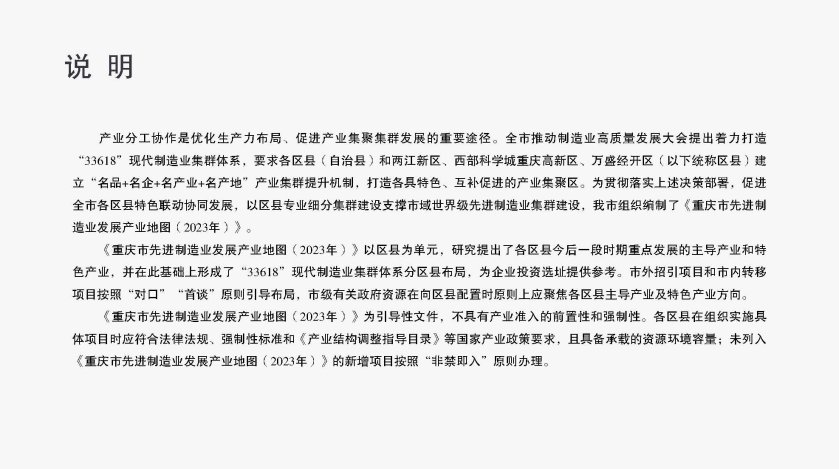 为深入贯彻落实全市推动制造业高质量发展大会部署,加强产业发展和空间布局统筹,经市政府同意,现将《重庆市先进制造业发展产业地图(2023年)》印发给你们,请按照职责分工协同推动产业地图落地。